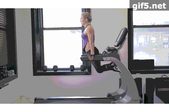 动作5:暂停跑步机,双手按在跑步机马达罩上。双脚向后蹬踩跑带。背部蜷缩,肩膀位于腰部之上,臀手下压。连续这个动作 2 分钟。