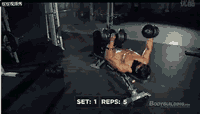 动作六:窄握哑铃卧推,3组,每组10到12次。