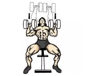 背 部 挺 直 , 坐 于 长 凳 上 , 正 手 抓 握 哑 铃 举 至 双 肩 连 侧 , 掌 心 向 前 。