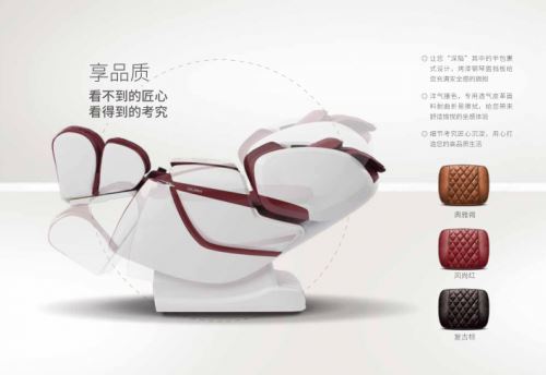 品质生活,源于内心的满足。忙碌的日子里,一块甜糕,一顿小龙虾,一场全身SPA,皆可从味觉、视觉、感觉上给疲惫的人带来片刻安逸的小确幸。如此,经过多次不断的改良,“知享椅”不仅在普通的“揉捏挤按压”的按摩功能上叠加了“瑜伽拱桥拉筋”技术,帮助体验者充分抻拉筋骨,伸展身体,助其在加倍畅快的按摩新体验中放松压抑的身体,尽享释放舒爽!其还采用了半包裹式的结构设计,以烤漆钢琴面挡板为怀抱,让用户“深陷”其中,享受满溢的安全感!同时,耐曲折、易擦拭的专用透气皮革面料质地柔、弹性佳、不松面,可以给人带来舒适愉悦的坐感体验,蕴匠心于考究细节中,让高品舒适按摩看得见,摸得着,享得到!