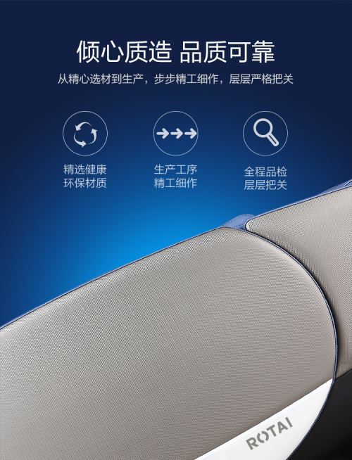 荣泰RT7700按摩椅精选健康环保材质,皮料富有弹性,给人以细腻亲肤的舒适感,皮套上针脚细密,没有多余的针脚𐨵𐙍和毛边,就连连接按摩椅小腿的拉链处也进行了非常巧妙的隐藏,可谓别具匠心了。