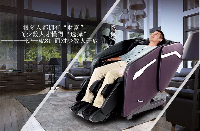 2016年最新松sunwtr按摩椅下 EP-MA81新品荣耀登场 ,新款上市!很多人都拥有“财富”,而只有极少数人才懂得“选择”--EP-MA81,只对极少数人开放!松下致力于为您创造出,可以媲美真人双手般按摩手感的按摩体验。将松下引以为傲的双重温热、三重揉捏、四种拉伸等多项技术融入新旗舰机型,并通过独特的设计理念,真正做到从颈部直至足底,环绕包裹,让您疲惫的身心得到深度的放松和愉悦。松下 EP-MA81新发现,透过臀部按摩,放松直到腰部。家中的专业按摩师,舒适的模拟真人手感按摩。拥有156种丰富多样的按摩技巧!