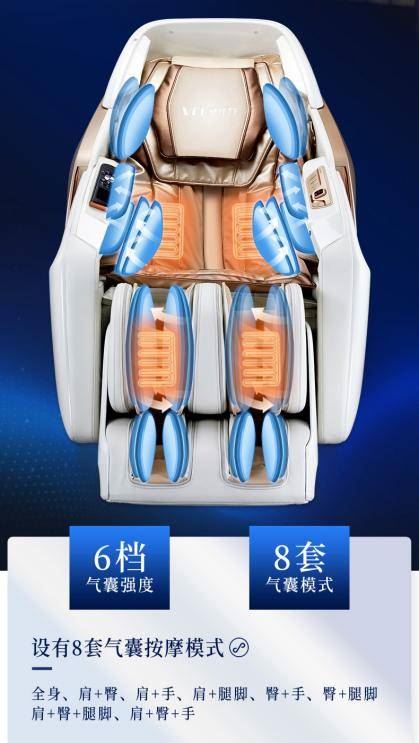 普通安全气囊只有一个档位,只能进行机械挤压。AI-AIR智能分级安全气囊拥有6种强度品牌的家用按摩椅,可主动监测人体疲劳程度,提升最合适的安全气囊充放电强度。