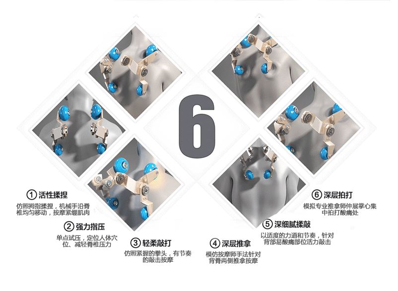 仿照专业推拿师伎俩:【活性揉捏】、【强力指压】、【柔柔敲打】、【深层按摩】、【深细腻揉敲】、【深层按摩轻拍】给您恬静的推拿体验!