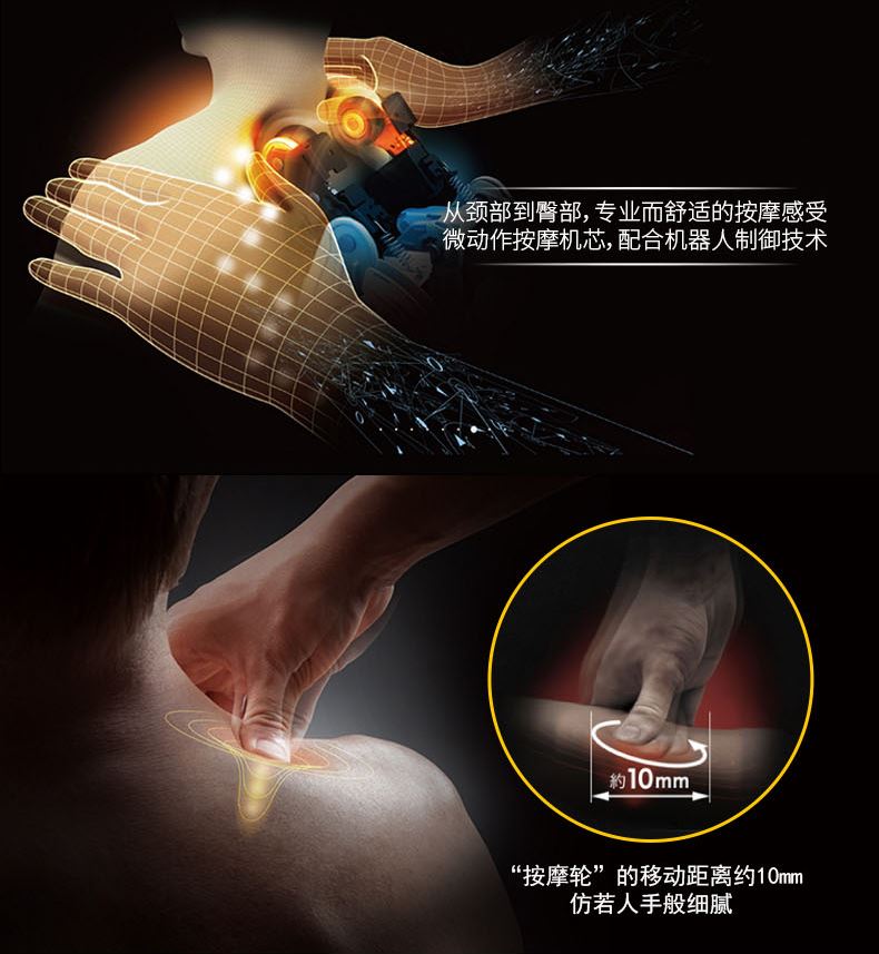 1、 第二代微动作机芯:能完全满意你想按哪就按哪的需求,推拿轮的直径移动间隔也被缩小到了10MM,能加倍集中刺激位于深层的酸疼处。