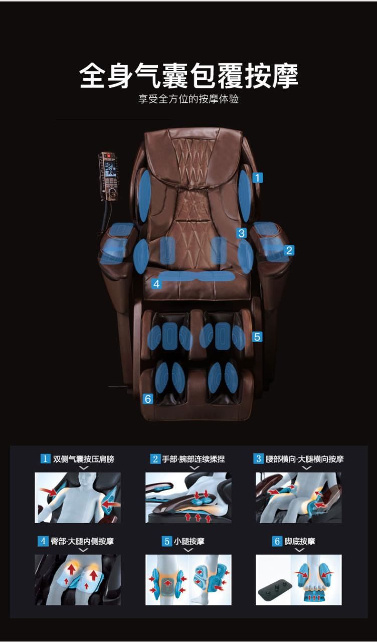 3、 内置9种主动推拿法式:揉抚懈怠、揉捏舒压、深度指压、全身伸展、肩颈重点、高速程式、上背重点、躯干重点共,推拿强度和蔼压强度也可以自行调整。