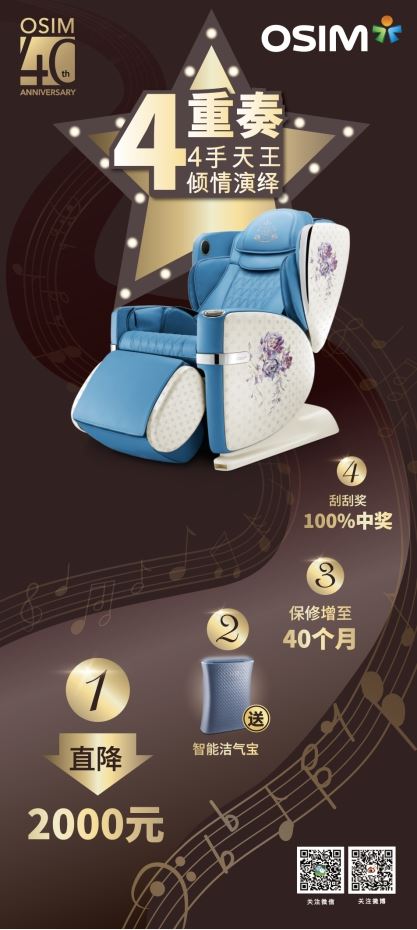 为了让更多用户体会到天王级按摩的乐趣,OSIM 4手天王按摩椅直降2000元。此外,现在购买OSIM 4手天王保修更是增至40个月,还送智能洁气宝,更可参与刮奖,中奖率100%。