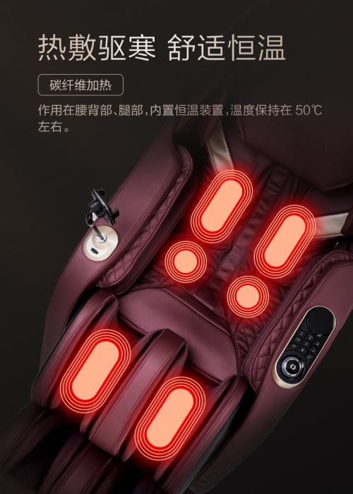 值得一提的是这款按摩椅对热敷功能做了全新升级,除了传统的腰背热敷外还新增了腿部热敷,加热装置是碳纤维材质的,升温快、安全性高,而且使用寿命很长。