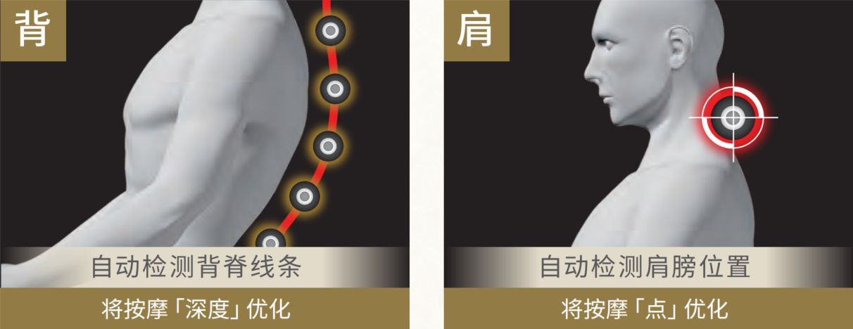 搭载的双重检测系统,自动感应背脊线条及肩膀位置,优化按摩的深度及按摩点,智能检知身体不同部位的压力和肌肉的酸痛状况,使按摩更加的贴合。同时拥有12段强弱调节,选择适合的强度,实现个性化按摩。
