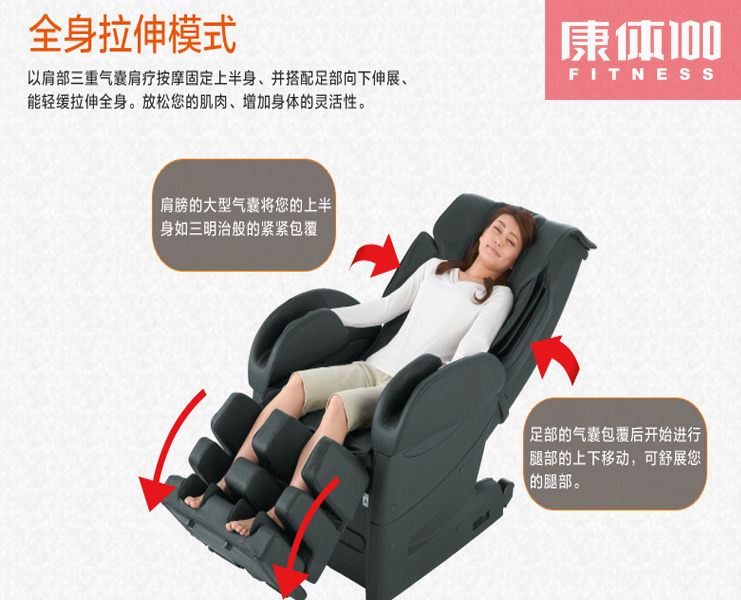 特有的拉伸按摩设计也是这个按摩椅的特色之一,以肩部三重气囊肩疗按摩固定上半身、并搭配足部向下延伸、能轻缓拉伸全身。放松您的肌肉、增加身体的灵活性。让您有伸懒腰全身放松的拉伸体验。