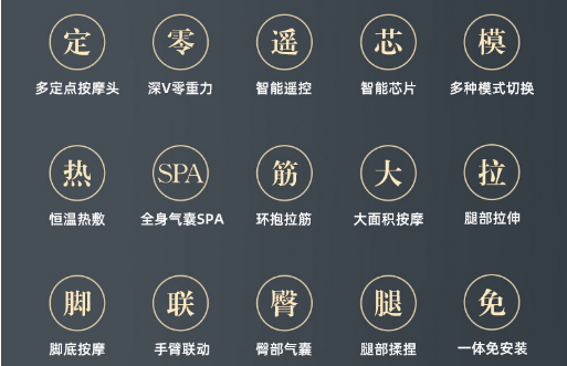 功效: 个别地方热疗 气囊力度调节 滚轮速度调节 按摩强度调节