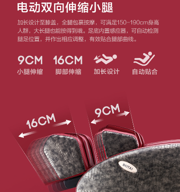 3、荣泰专利“双向小腿伸缩”完成小腿双向拉伸牵引按摩,小腿共有16层气囊,模仿按摩、掌压的手段,缓和久站一日之后的疲惫,特别拉伸聚星天华小说功效辅助 小腿自由伸展,有用丰硕小腿按摩恬静度。