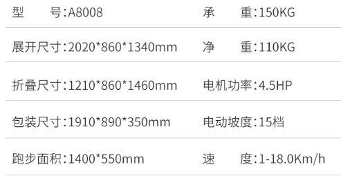 采取 55厘米黄金跑带,液压8级减震,静音降噪。15档坡度电动调节,承重150KG。