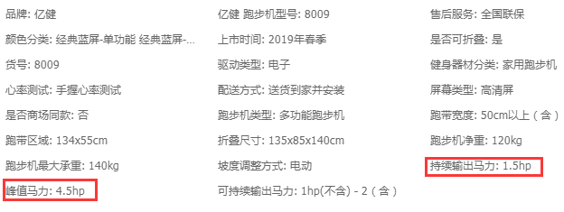 许多跑步机遇标注双马达电机,并且峰值功率4.5HP,这里的4.5HP只象征的是这台跑步机的峰值动力,而峰值动力仅仅是启动时跑步机最高运作下的动力。故此说,电机的峰值马力只能作为参考,并不是一台家用跑步机的真正马达功率值,咱们要看的是其连续马达功率。好比下图的亿健8009所示: