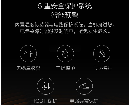 5类重掩护:无锅具报警、干烧掩护、过热掩护、IGBT掩护、电路不正常掩护等,内置温度传感器与温度掩护体系,5类重保险 掩护,避免危险的产生。
