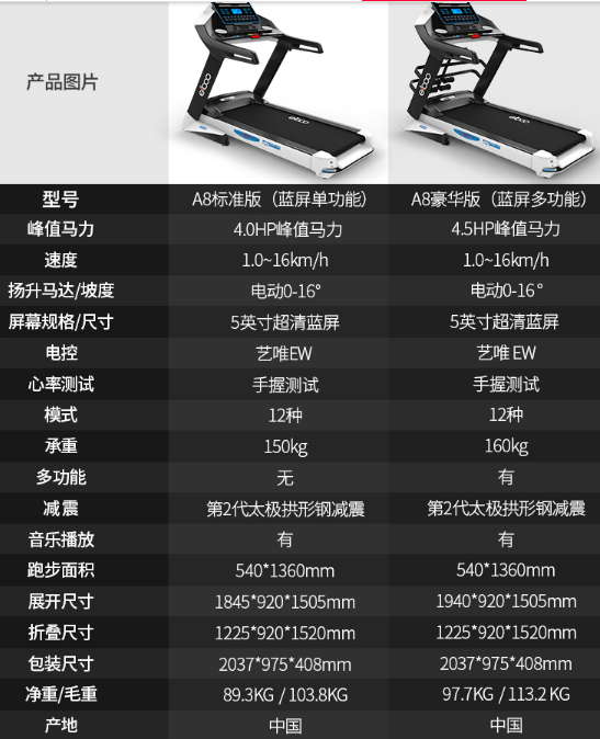 上述两款中,以A8这款跑步机较为合适家用,外不雅与众不同,品德精彩,性价比高。相对于同价位跑步机来说个头要年夜一些,不仅表示在整机尺寸上,跑步区域面积也年夜了很多,54cm的跑带宽度是一般家用跑步机不具备的,搭配4.0HP上述强劲马达,承重高达200斤,实用人群广??梢运翟谡飧黾畚欢?,假如你想挑选一款综合设置装备摆设都很高的跑步机,那么这款是最好挑选之一。假如你提早打算有限,对速度没有刻薄的请求,同时又想要一款高性价比、年夜气、雅观、娱乐功效齐备的年夜彩屏家用跑步机,这款可以名列三甲。