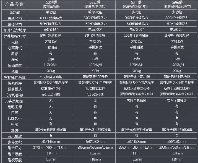 总的来说,S8动感曲线设想,特有分体模具设想,尽显王者风仪。EW3.0欧标芯片,5.0HP强劲马达动力,1500*580mm超年夜跑带面积,18mm5类层贸易跑板,第2代太极拱形钢减震,16档坡度调节,16km/h锋速劲跑,200KG最年夜承重。15.6寸宽屏触摸彩屏,安卓体系wifi上彀,智能影音,支撑APP下载,活动数据共享功效和3D实景模仿体验模式。带有氧风气,ipad娱乐支架,usb音频插口,多功效包含按摩头,扭腰盘和仰卧起坐的应用。