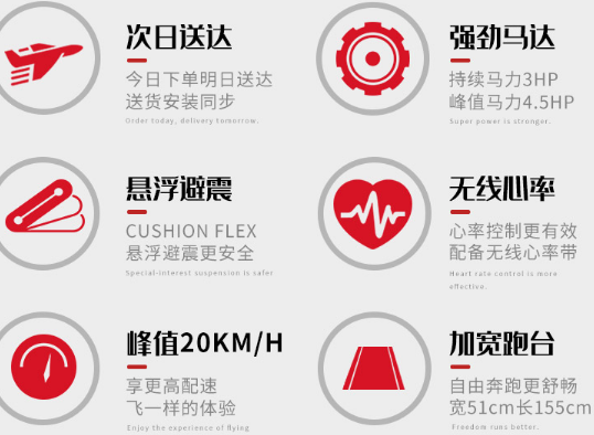 跑带区域: 155x51cm;跑步机净重: 115kg;跑步机最年夜承重: 150kg;连续输出马力: 3hp;峰值马力: 4.5hp;速度调节规模: 1-20Km/h。