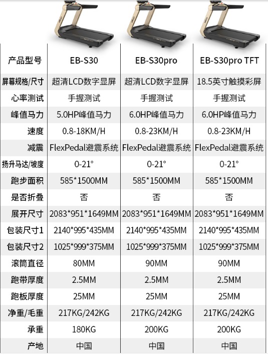 LBOO益步EB-S30价钱是9999元-16999元,分为S30、S30Pro、S30Pro-TFT等三种设置装备摆设可以挑选。是益步品牌2019年夏撨日推出的跑步机产物。
