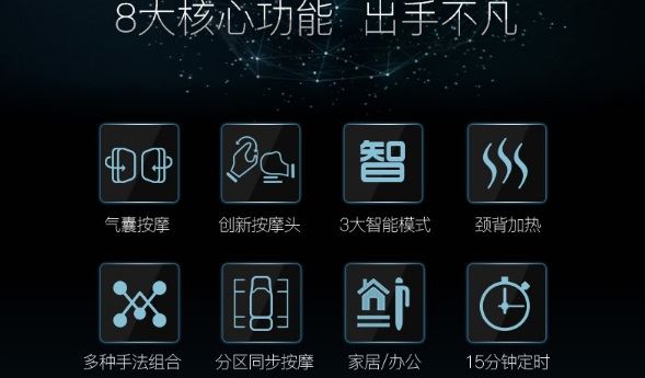 气囊:腰部、背部和臀部支持气囊捏按摩;模式切换:支持三种智能模式,切换模式时,按摩重点不同,上下10cm可定点升降,支持不同身高的人,支持取暖