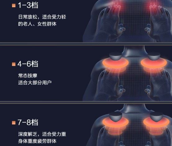 这款主推色系:鎏金黑、魅影黑,分别适应不同家居风格。这款有按键功能又有触摸屏的设备,很合适近视眼的人群,按起来也感觉很舒服,很在意肩膀这块,用御宅模式快捷又准确的可以按到想要的效果,各种力度调节,还有脚和小腿也有温度,这么冷的天按也没觉得冷。价格虽然高一点,但作为欧利华高端型号,其功能和价格是很相称的,值得拥有。