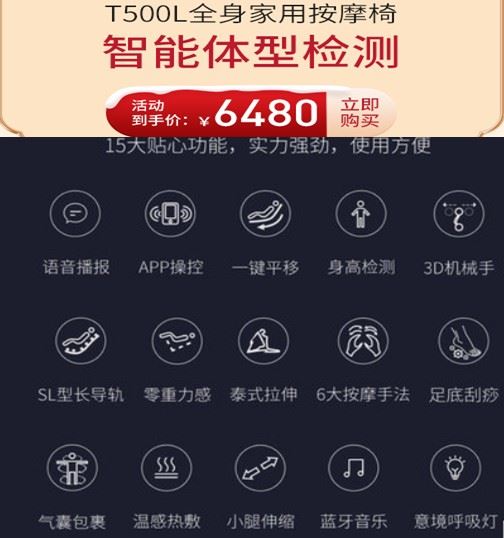 1、迪斯T500L:这款价格5980元,非常适合老年人使用,因为它可以蓝牙语音链接天猫实现语音控制,也就是父母在使用的时候,无需使用繁琐的物理有线??仄?,只需要发出指令,按摩椅就可以按着用户的需求开启程序按摩。其有15大功能,如下图示。