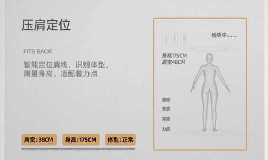 采用小机身造型搭配一键前滑设计,靠墙距离只需要12cm就可以,展开后占地面积也只有约1.5平方米的空间;另外还配置有智能肩部检测功能,根据肩部位置检测,智能定位身体型态,为后续按摩提供博熈来更加准确的数据支持。