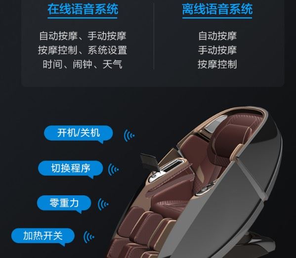 语音指令离线和在线均可支持,配备着强大的AI语音系统,我们可以选择按摩模式、打开加热开关,也可以来设置闹钟、查看天气,还可以唤醒系统内置的喜马拉雅,来听听郭德纲的相声。
