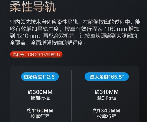 使用业内创新技术自适应柔性导轨,在躺倒按摩的过程中,能够有效增加导轨广度,按摩有效行程从1160mm增加到1210m万良贴吧m,再配合双机芯,让按摩从颈肩到大腿的全覆盖,增强了按摩的舒适性。