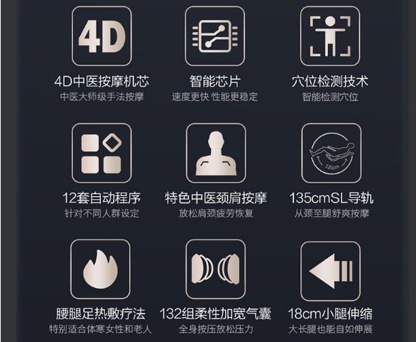 导轨行程:135cm超长S型导轨 按摩机芯:4D中医圣手 芯片:美国进口芯片 电机:无刷静音电机 腿部:18m自动伸缩 加热区域:腰部、背部、足部 零重力:一键前移 自动程序:12套智能程序 小腿:气囊夹击按摩 气囊数:132组柔性气囊 按摩力度:6档力度调节+3档气压调节