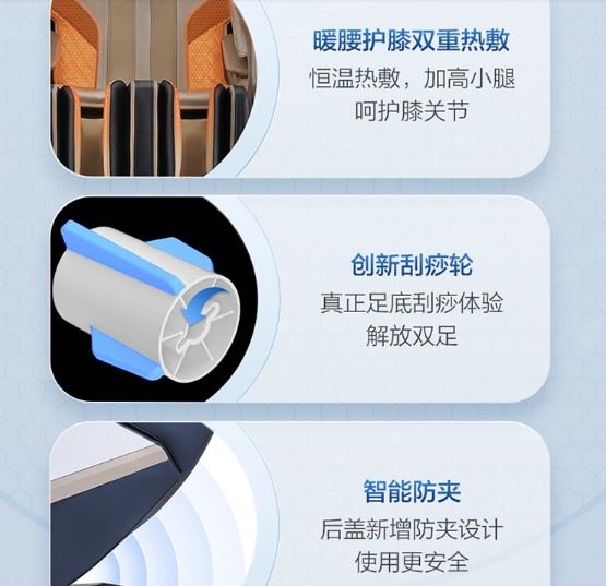 荣泰A60按摩椅分布在肩、手、腿、足、手部的气囊,宽度有10厘米,全身被气囊紧紧包裹后,在间歇式充气放气过程中,享受波浪式的节奏挤压按摩,加持腰、腿和膝盖部位的碳纤维和石墨烯材料加热功能,提升着肢体血液循环!