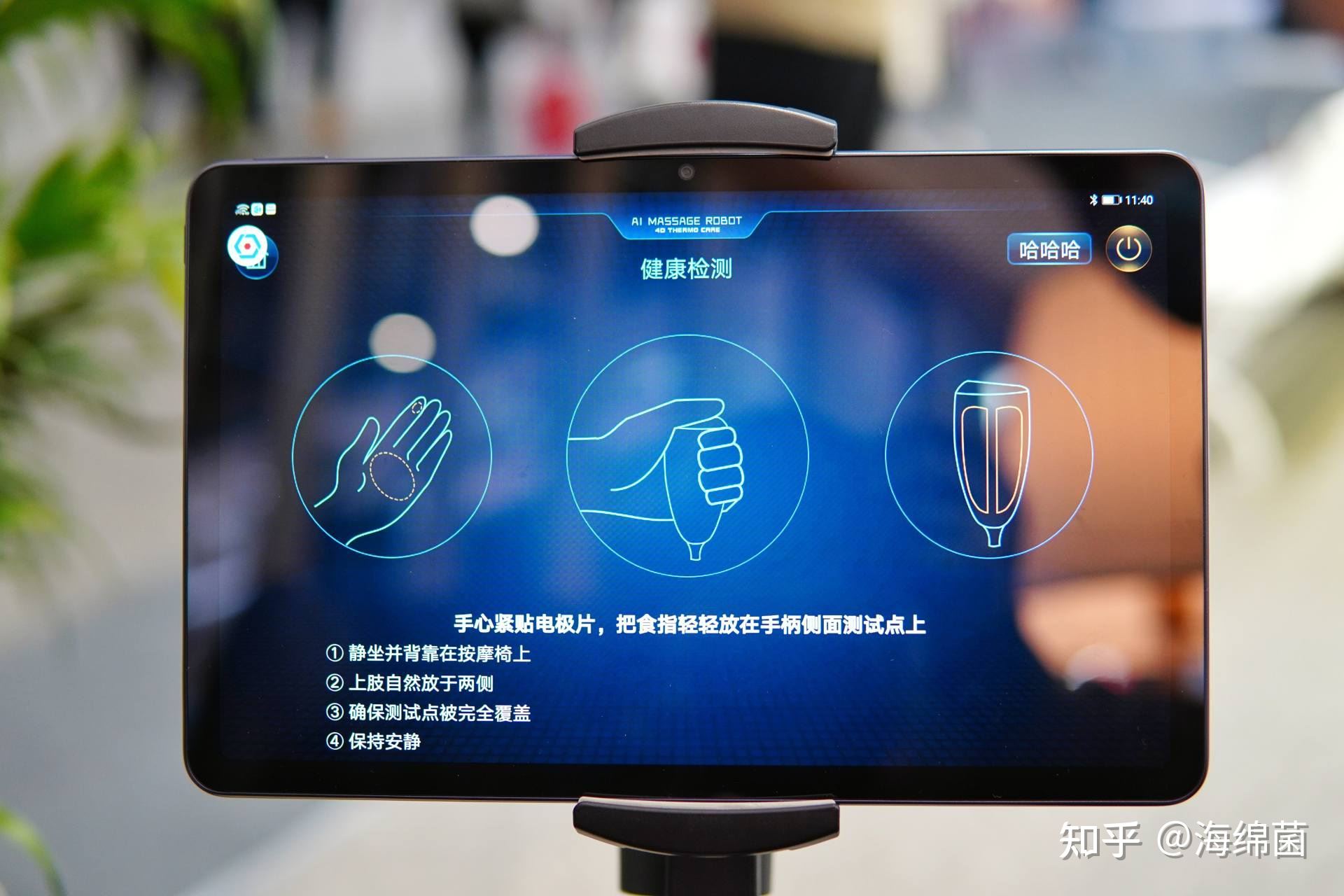 屏幕下方有个手柄吸引了的注意,现场工作人员告诉我,这就是这款按摩椅的核心优势之一:疲感追踪科技。使用前只需要智能检测一下,就能测得9大生理参数,通过AI的智能算法细化分析之后,给出私人订制的按摩模式。