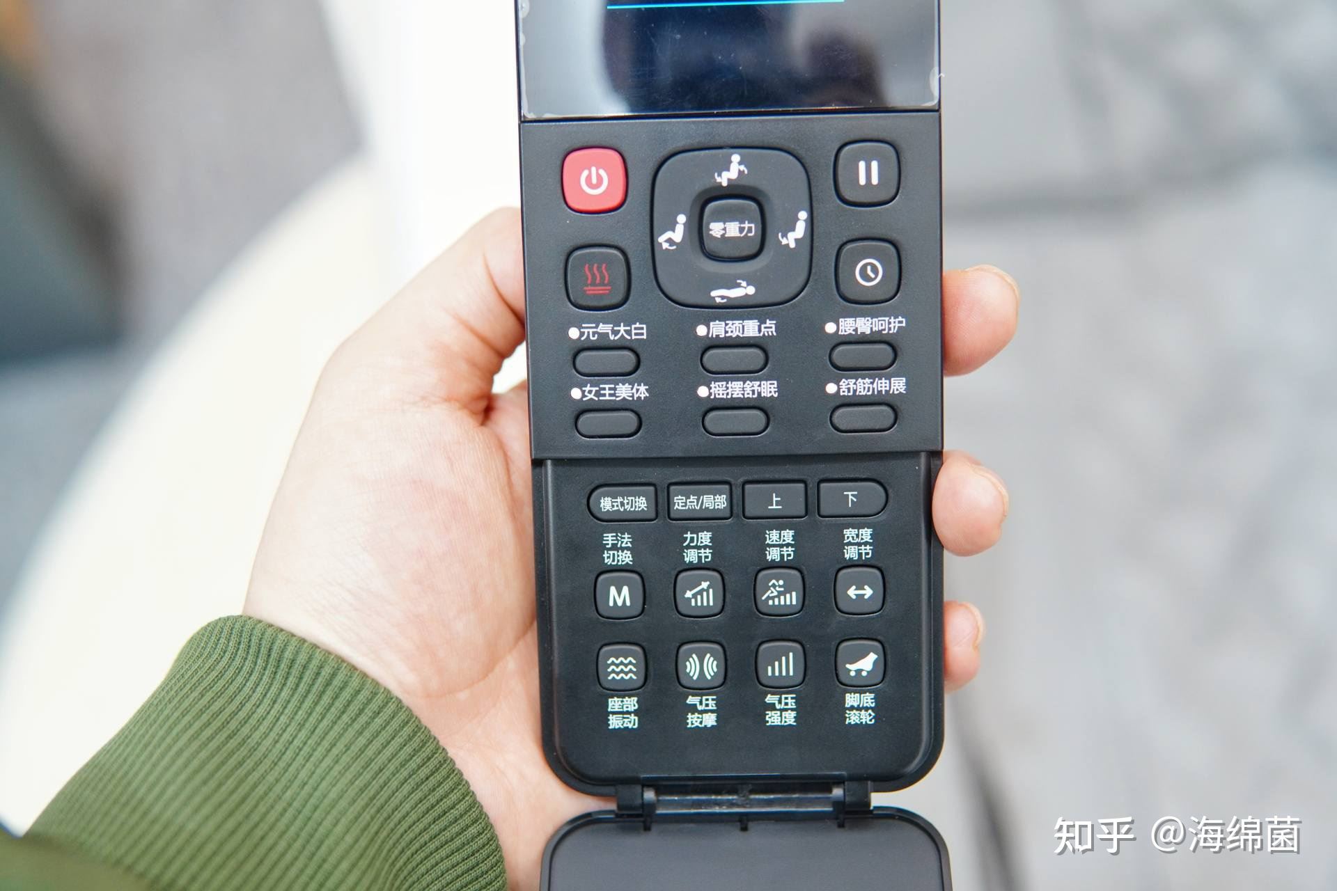 大白奥自带??仄?,翻盖式的遥控器设计,常用区域是六种预置模式包括:元气大白,肩颈重点,腰臀呵护,女王美体,摇摆舒眠,舒筋伸展。翻盖区域则是手动调节按键,包括按摩手法,力度,速度,位置等,都可以在这里自行设定。