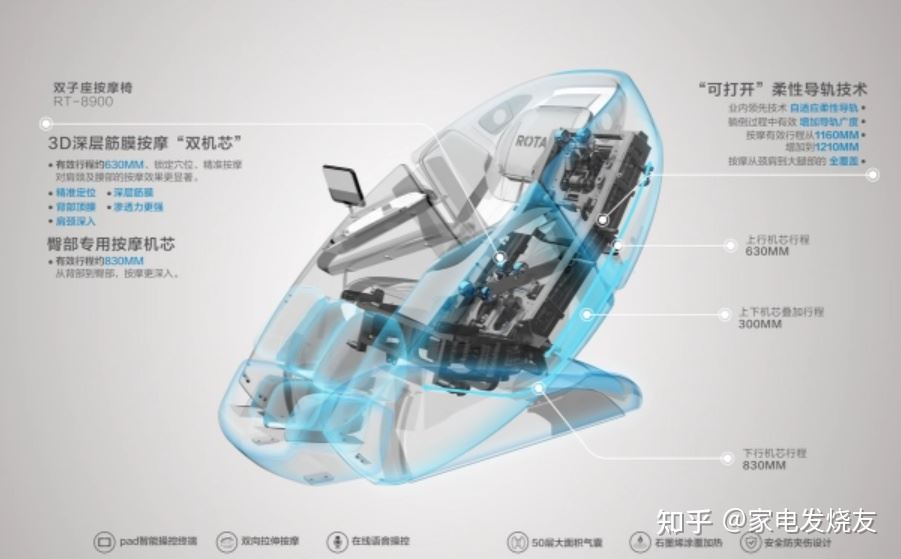 机芯是按摩椅更新的核心技术之一。已研发出按摩椅业内第5代4D无刷变频温感机芯以及第6代5D智能无刷按摩机芯。