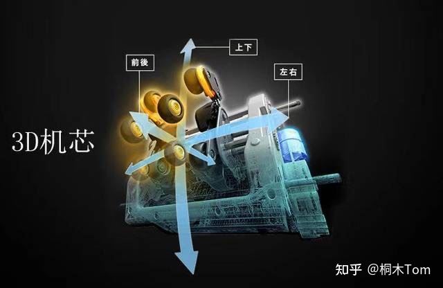 从图上就能看出要比2D多一个前后功能,整体的体验可是大大的翻倍呀;目前还有很多品牌也推出了4D机芯,其实4D机芯也就是在3D的技术上改动一些,体验上基本上感受不出来,而且4D机芯的按摩椅价格也是极其昂贵的,个人感觉性价比还是很低。
