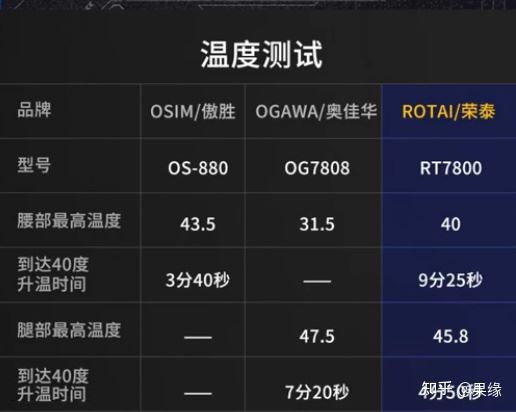 奥佳华腰部的温度比较低,而腿部的温度又过高,所以长时间可能会有低温烫伤的风险,而荣泰的背部则是两侧升温高,腰部温度比较低,腿部也存在局部升温过高的问题。