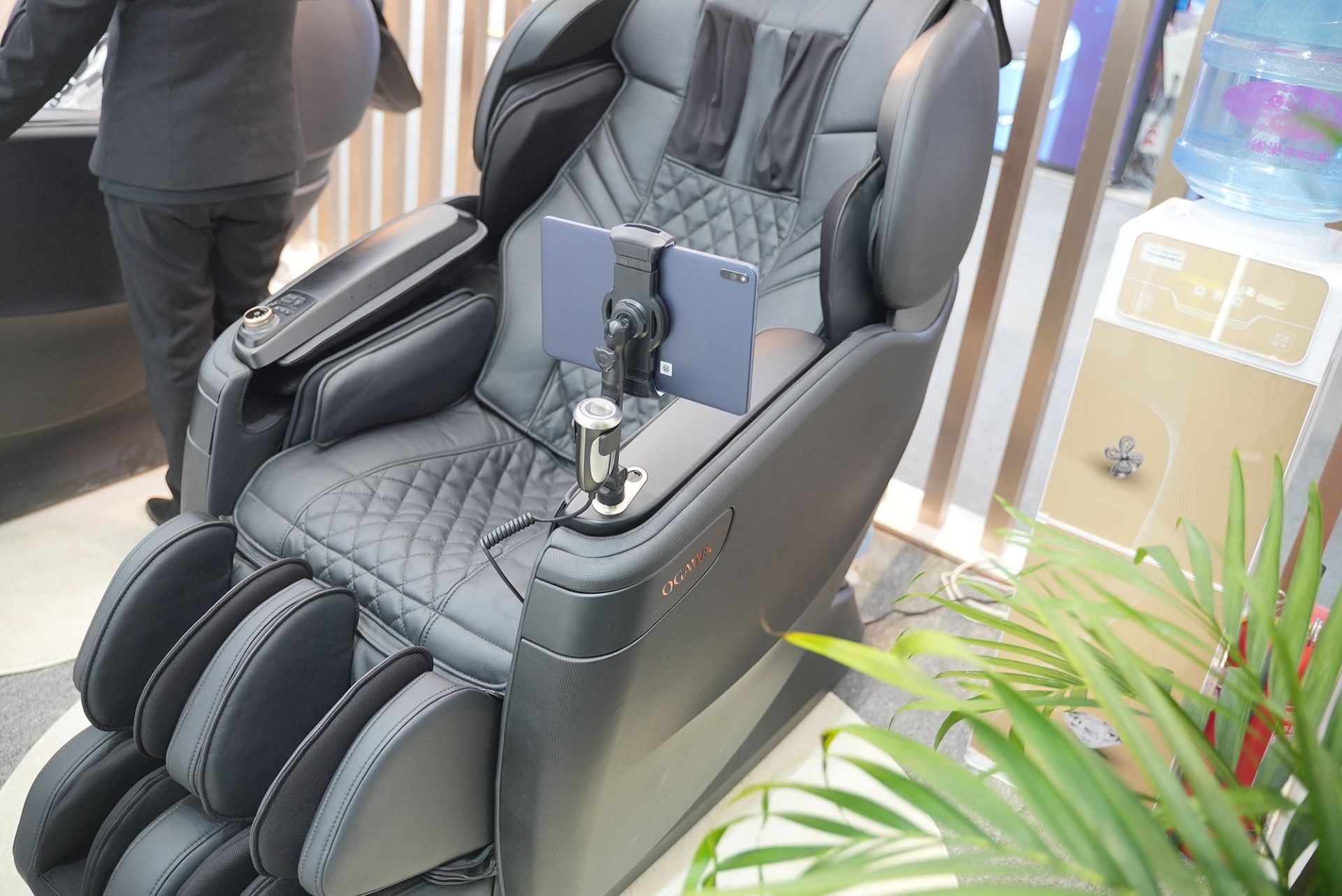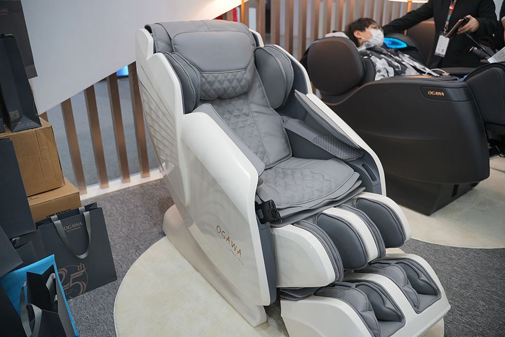 下面咱们再去到大家最喜欢的按摩椅体验区域,在这里陈列了三台按摩椅,可以供观展用户体验,只不过奥佳华展台人气太旺,过来体验按摩椅的人络绎不绝,想要坐上按摩椅只能老老实实排队,所以就先来和大家分享分享产品外观吧。