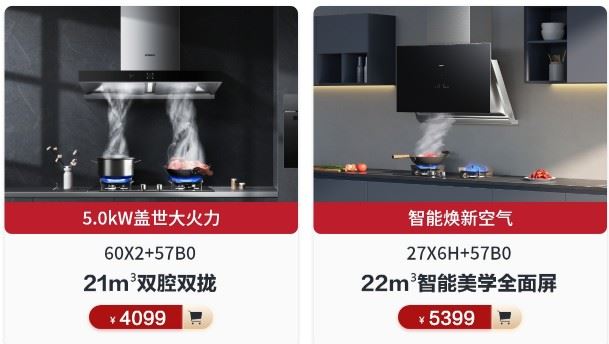 吸抽油烟机燃气灶套餐,老板双腔大吸力 正对油烟 吸得更准,价格3999元,顶吸式。213/min的强劲风量
