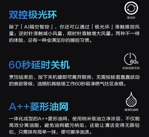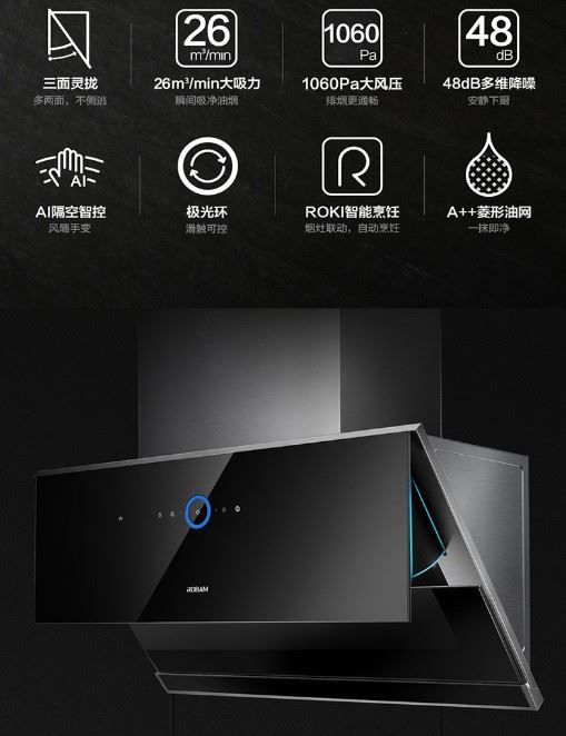 做饭时手上难免沾上食物汁水或油污,按在黑色面板上的指纹简直要逼死强迫症,而这种挥挥手就能掌控油烟机启闭的设计就很人性化了。