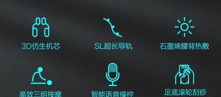 2. 特色功能有12段颈肩按摩,小腿4D机械手和双重气囊按摩,小腿两侧还能加高加厚以及延伸,6档的力度调节,背部,腰部以及足底恒温热敷,三挡零重力设计;
