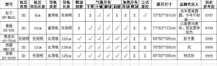 以上就是按摩椅的一个简单选购思路,我也把我做的对比表给大家了,如果你想对比个1.2W档位甚至更高档的3-4W档次的按摩椅,你也可以类似做个这种表格进行对比就行,最后可以选出你觉得合适的若干款,再看看有没机会线下试用,没有就看看评论也可以。