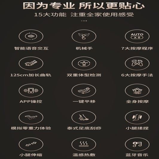 2、配置有全新2代3D智能按摩机芯,采用全新多层芯片,并且配置有三档宽幅自由调节功能,不管是怎么样身型的用户都可以调节到合适的按摩位置,恢复平衡成就同时还具有性能稳定和速度快等特点;还配置了127度仰躺零重力太空舱按摩功能,犹如漂浮在太空舱一般,带用户体验太空“失重”的按摩体验。