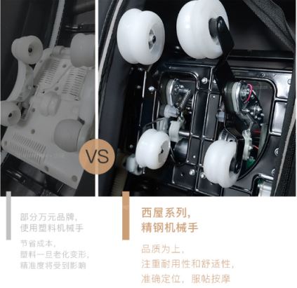 在材质上,我们自然不能忽视一台按摩椅的“芯”。西屋S500的机芯与传统按摩椅的不同,市场上某些按摩椅的机芯为了降低成本,采用的是塑料机芯,长时间使用,塑料可能老化变形,影响使用寿命以及按摩的精准度。以品质为上的西屋却采用了3D精钢材质,通过这个精钢3D“机械手”的上下、左右、前后灵活游走,可以深层触达酸痛肌肉,再配合多种按摩手法和精准定位的按摩至人体筋膜,能快速驱赶身体紧绷的酸累感。而且精钢材质不仅能精准定位、贴服按摩,还能大大提高按摩椅的耐用性,让用户可以体验到极致的按摩体验。