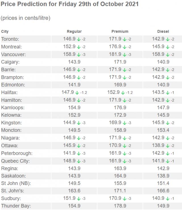 根据Gaswizard.ca网站的预测,加油最便宜的地方是Peterborough,那里明天的油价是每升141.9分。Kingston的油价是144.9分,渥太华的油价是145.9分。