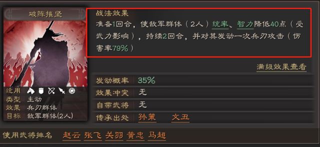 赵云是队伍的输出,主战免疫控制,选在速度上会比关羽快一些,可以让关羽的输出得到一定提升。战法选择破阵摧坚+所向披靡,破阵摧坚可以大幅度降低对方的双属性,降低法师伤害,配合披靡加兵书将威鬼谋提高伤害很容易打出非常高爆发,