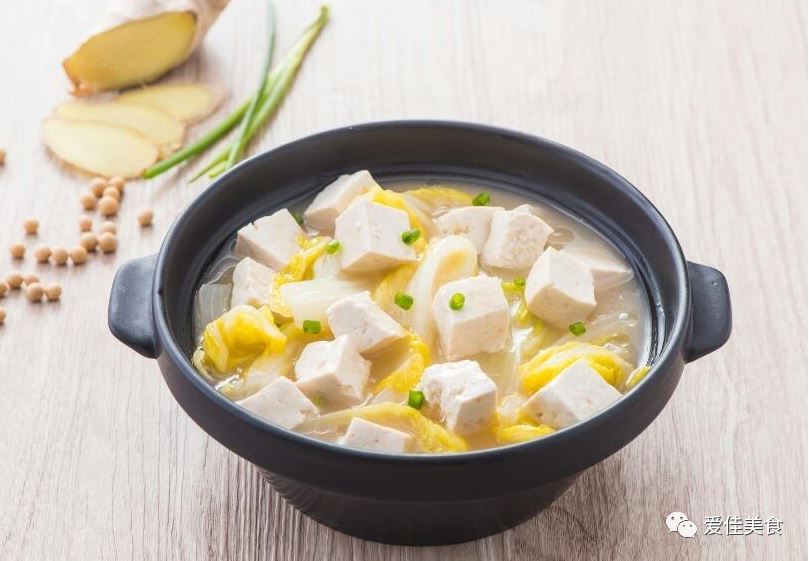 3、砂锅加水烧开,加入姜末,下入豆腐块,煮5-6分钟。