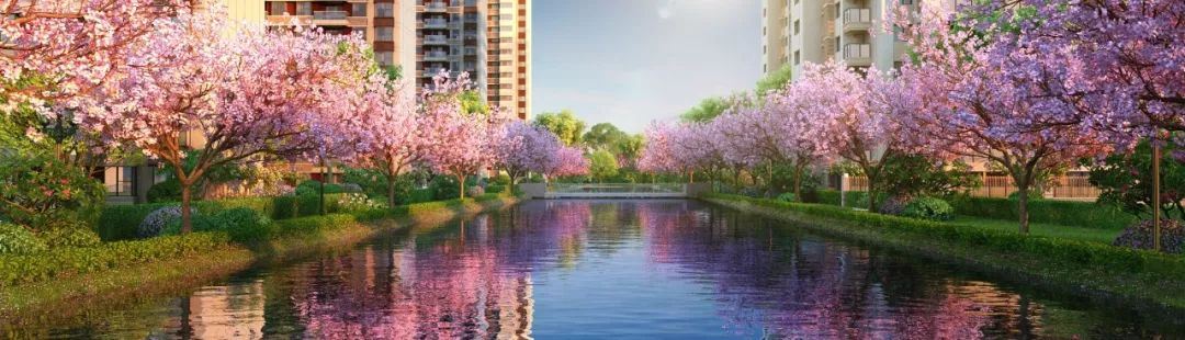 项目在滨水休闲步道设计阵列樱花树,未来业主闲暇之余沿着河边散散步,赏赏?;?,悠闲自在。