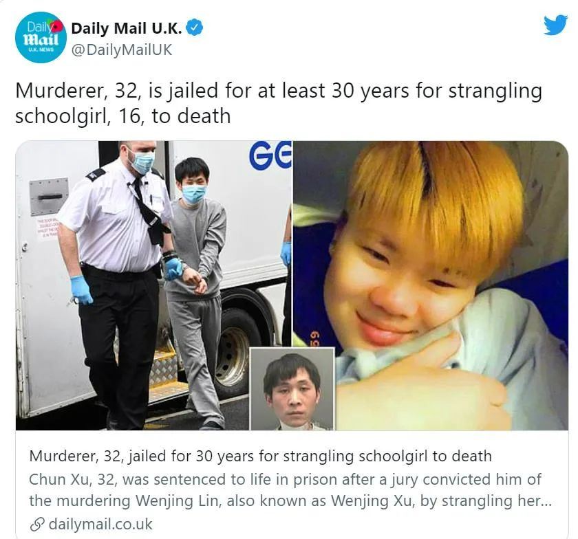 根据报导,3范博梅尔打伞2岁徐春(Xu Chun,译音)被控3月5日在韦尔斯一间中式料理外带餐馆杀害16岁的林文静(Wenjing Lin,译音)。此外,徐春也持刀攻击林文静的继父、餐馆店主蒋永泉,谋杀未遂罪成立。