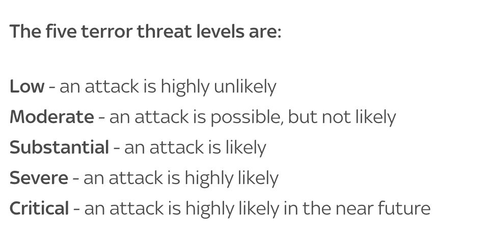 据悉,“严重”是第二高的恐袭威胁级别,意味着“很有可能”发生恐袭,英国上一次将恐袭级别调高至“严重”是在2017年9月帕森斯格林火车爆炸事件之后。