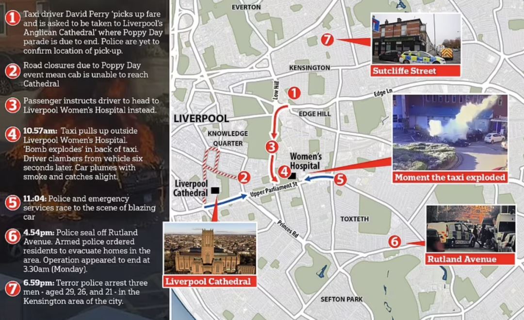 在英国昨日发生的自杀式恐袭中,一辆出租车在利物浦妇女医院门口爆炸起火,致1死1伤。英国反恐警察随即介入调查,并依据《恐怖主义法》逮捕了3名男子。